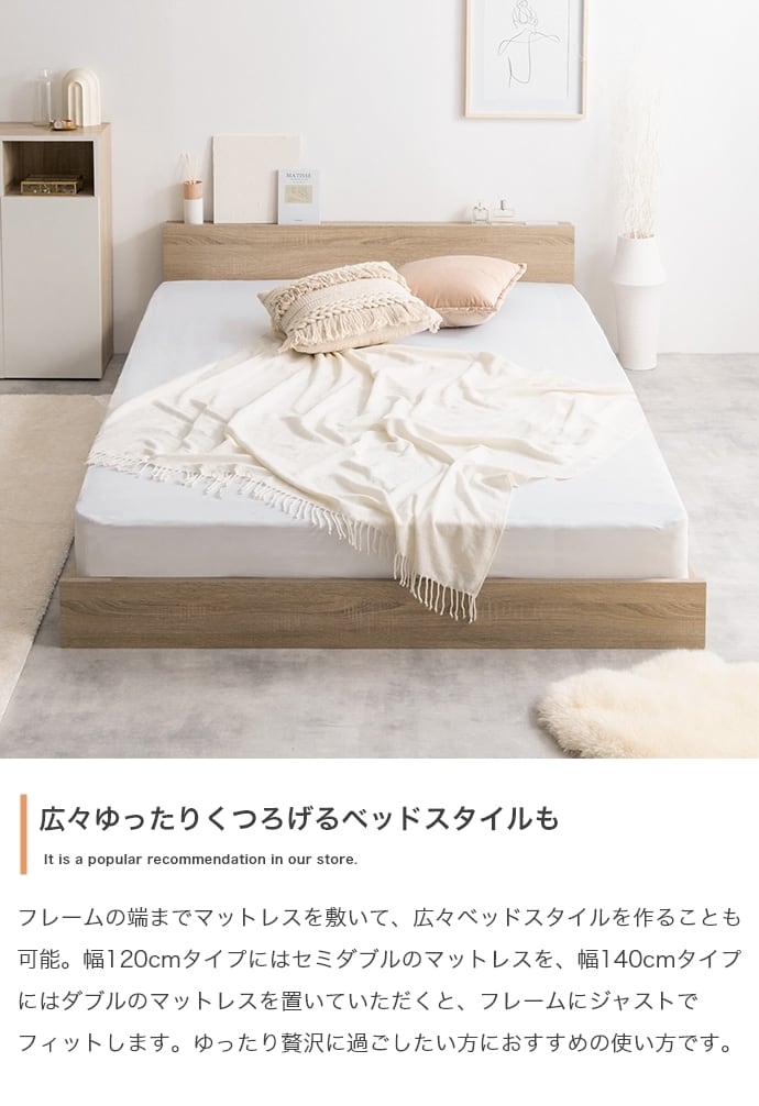 マットレスのサイドにはスペースができる幅広設計で、小物や本などを置いていただけます。また、ロータイプで空間を広く見せることができるので、ワンルームやスペースに余裕のないお部屋にお住まいの方にもおすすめです。