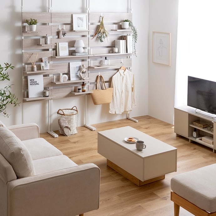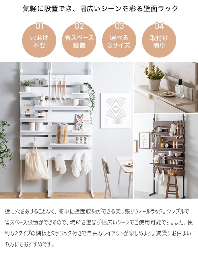 突っ張りウォールラック。シンプルなお部屋に馴染みやすいデザインで省スペース設置ができるので、場所を選ばず幅広いシーンでご使用可能です。さらに、便利な2タイプの棚板とS字フック付きで自由にお好みのレイアウトに変えてオリジナルの空間作りをお楽しみいただけます。雰囲気を変えたい方や、賃貸にお住まいの方にも使いやすくおすすめです。