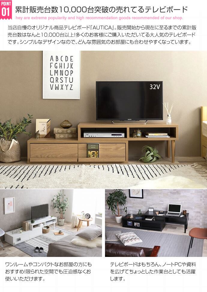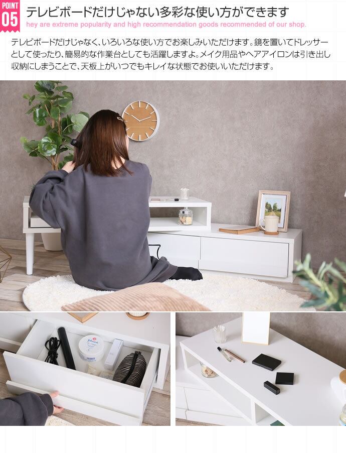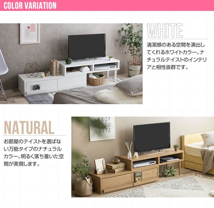伸縮・回転してレイアウト自在のテレビボード!引出しが2杯ついて収納力もたっぷり!テレビボードやPCデスクとしてもご利用いただけます!当店一番人気のロングセラーのテレビボードです。