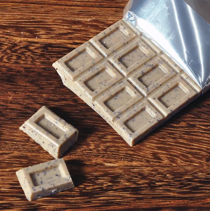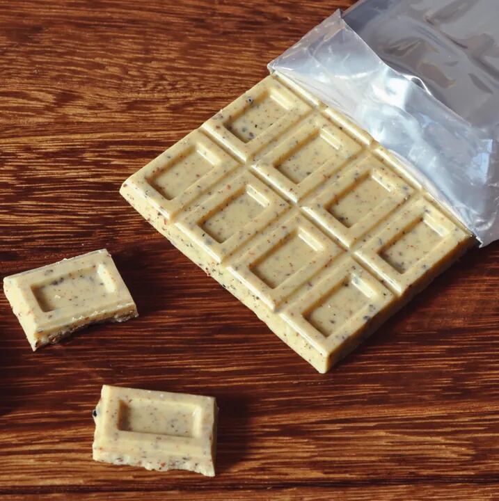 カフェインレスコロンビアコーヒーを、蒜山ジャージー牛乳を使ったホワイトチョコに合わせました。コーヒーのほろ苦さとざらざらした食感がたのしい、オトナな味わいです。